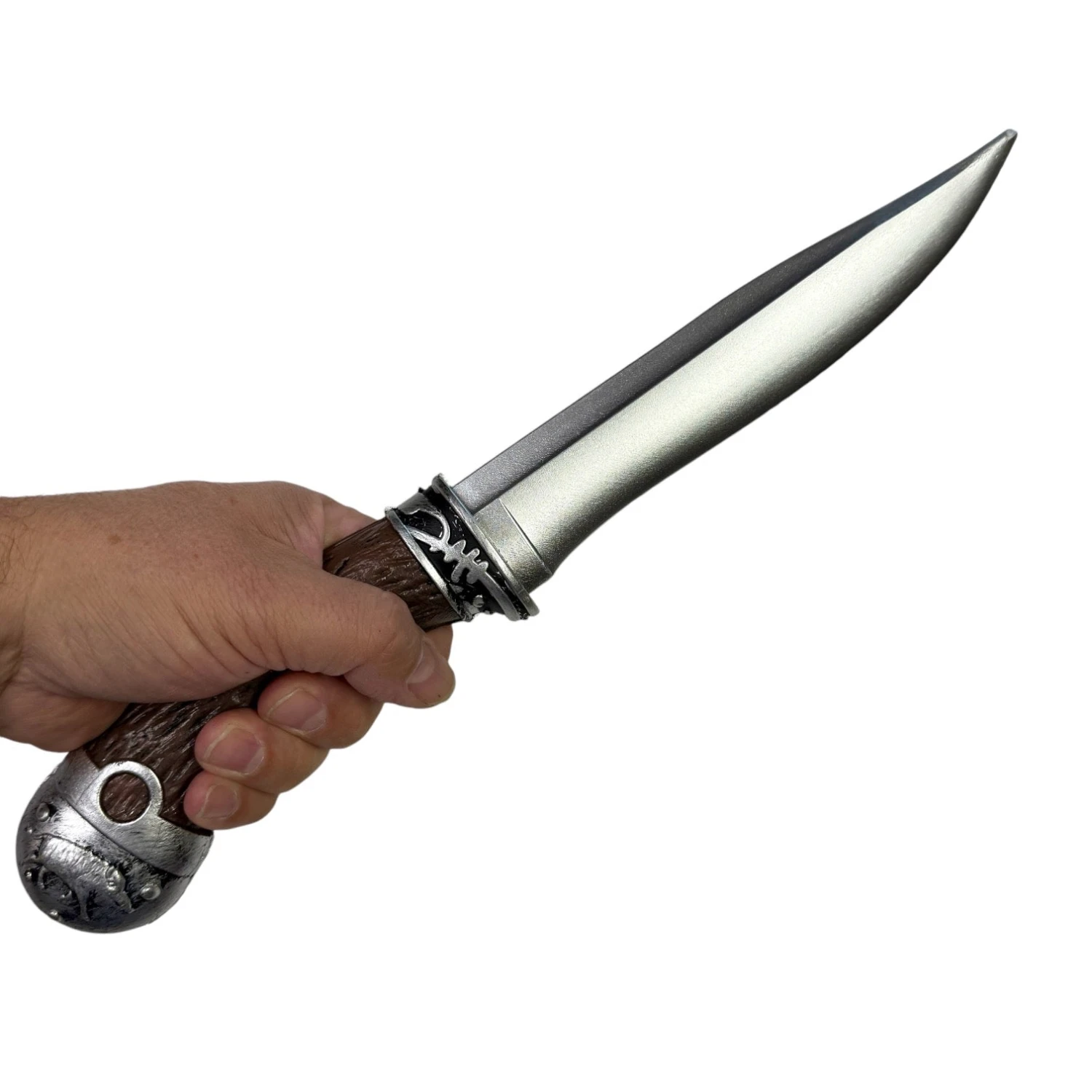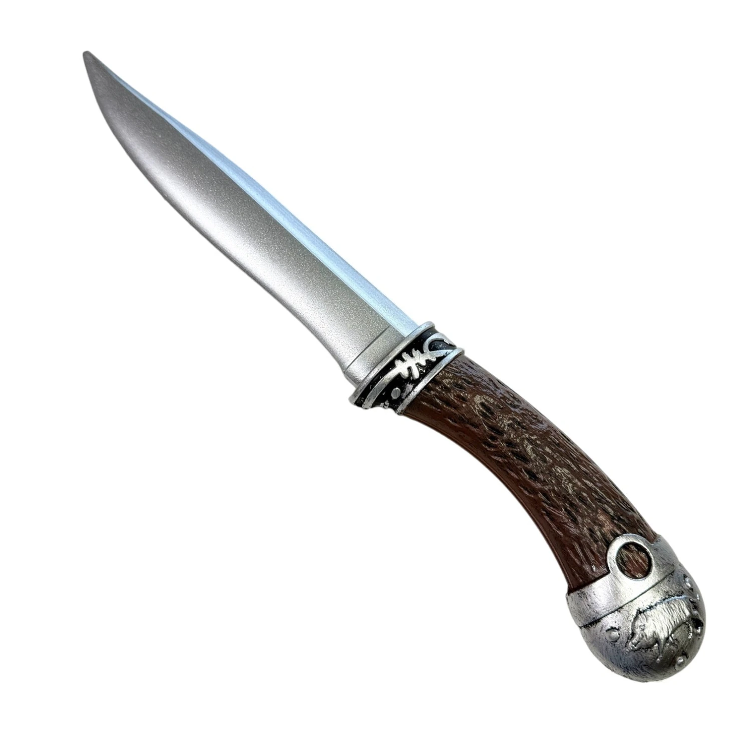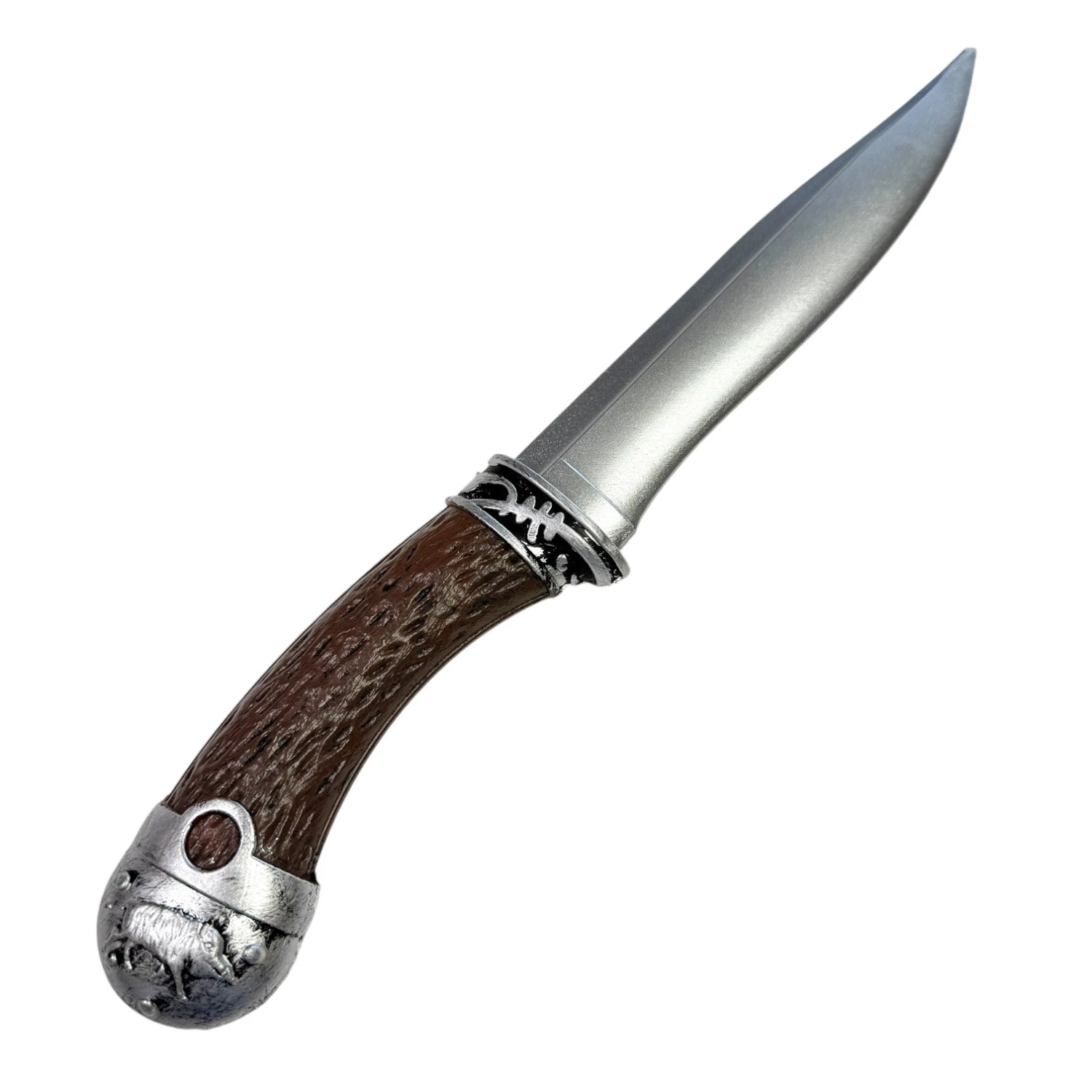 This 14.5 inch foam knife prop is durable, lightweight, expertly crafted with a wood grain texturized handle and a boar engraving. This hunting knife’s real life counterpart is typically handcrafted from hardwoods like walnut or oak. The boar engraving adds a decorative element, reflecting themes of hunting and nature. This type of knife is generally used by a hunter, camper or rugged type character in film.