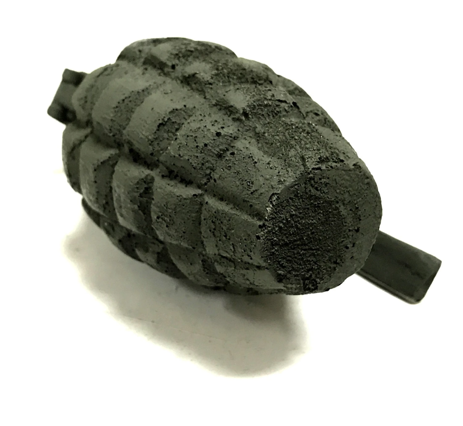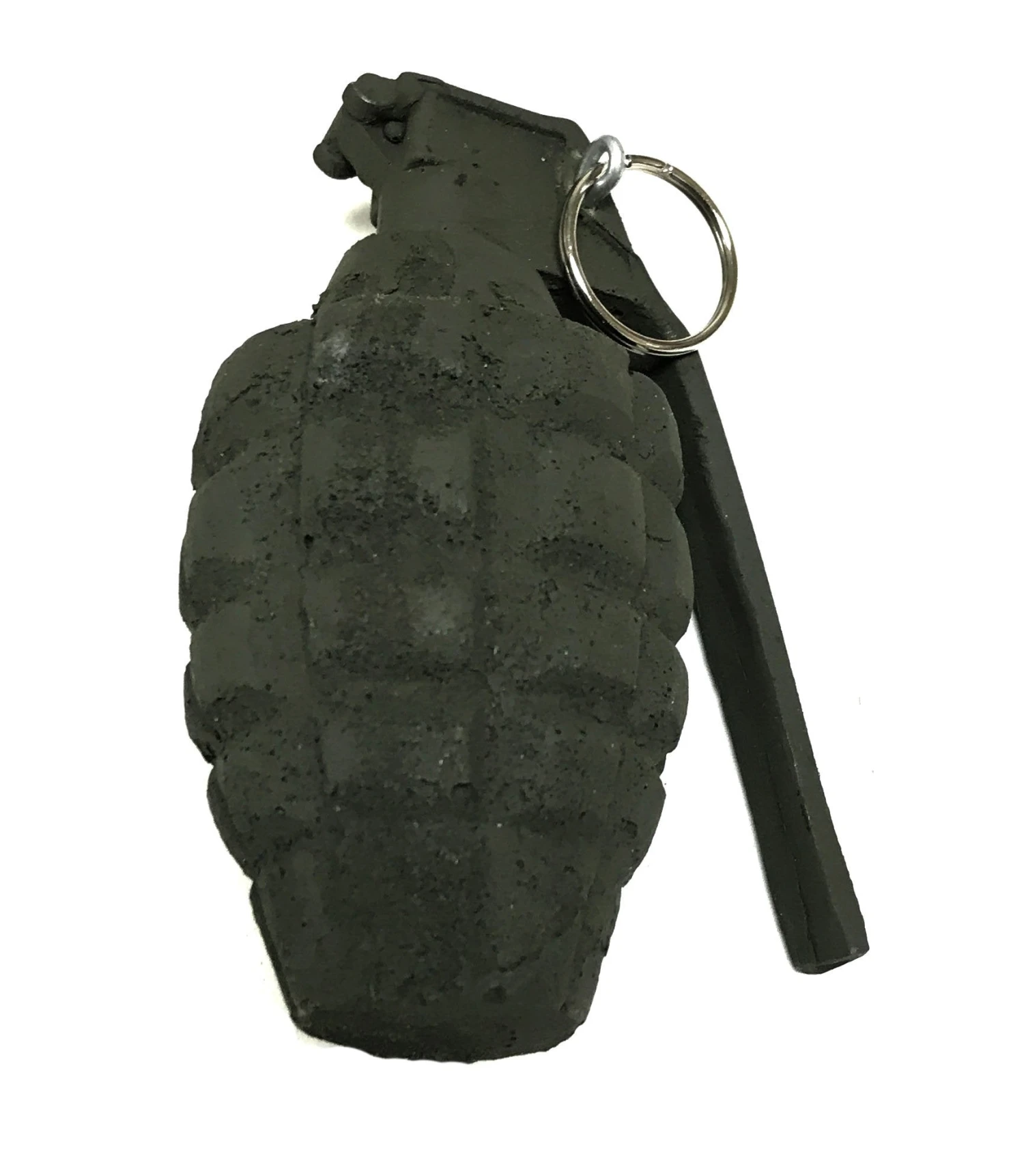 This replica of a US Pineapple M2 style fragmentation hand grenade is molded from the real thing. The base is made from a flexible foam and the timer is cast from rigid urethane plastic, pin and ring are fashioned from metal. Great for use in military scenes requiring the dangerous looking replicas. Please contact us for a Cosplay convention friendly version!