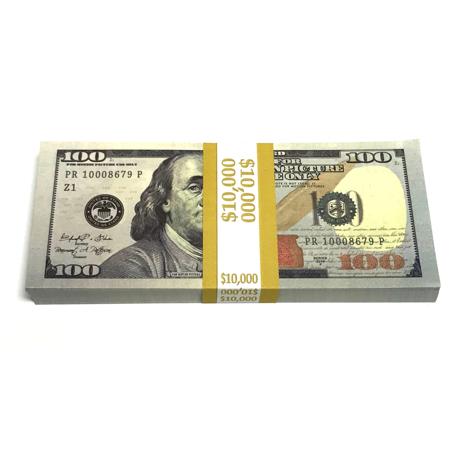 This is a crisp new $100 dollar bill stack that would equal $10,000 in fake cash. Each item features (100) pieces with 2-sided full color printed in the New Style $100 bills. Each stack comes with a removable $10,000 bank band. No blank filler sheets. Stunning detail and quality. Professionally printed and cut. These are made by the leading producer of motion picture prop money.