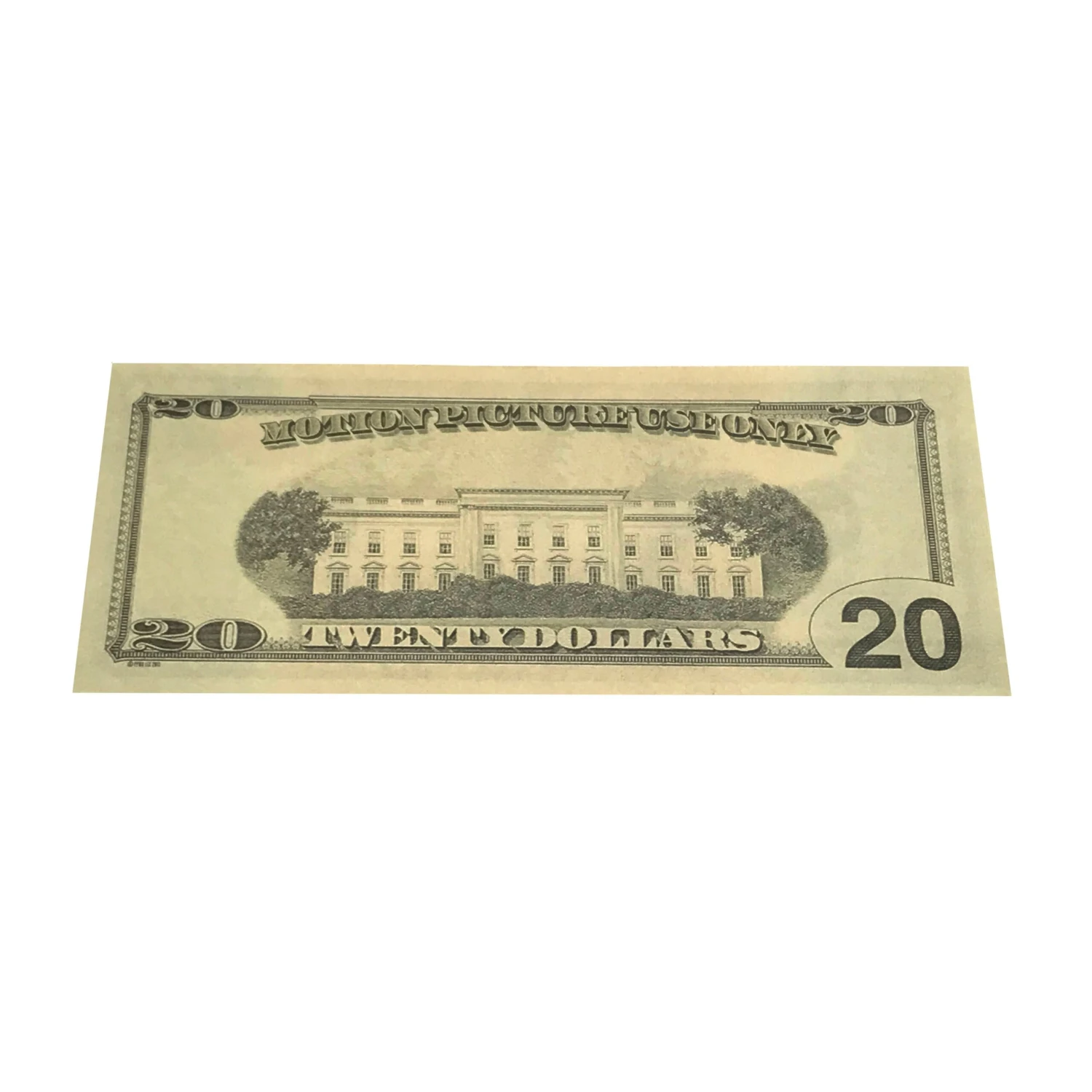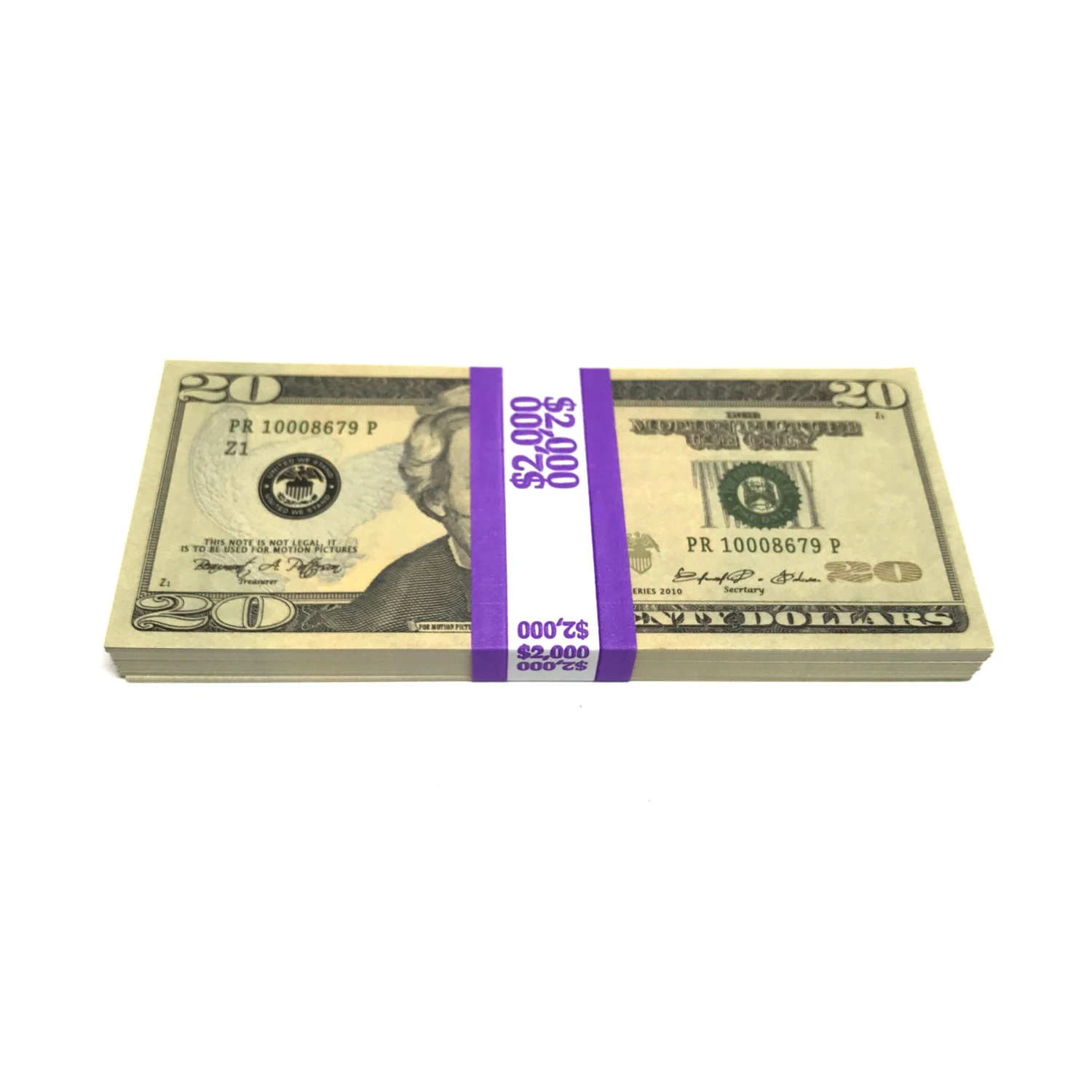 This is a crisp new $20 dollar bill stack that would equal $2,000 in fake cash. Each item features (100) pieces with 2-sided full color printed in the New Style $20 bills. Each stack comes with a removable $2,000 bank band. No blank filler sheets. Stunning detail and quality. Professionally printed and cut. These are made by the leading producer of motion picture prop money.