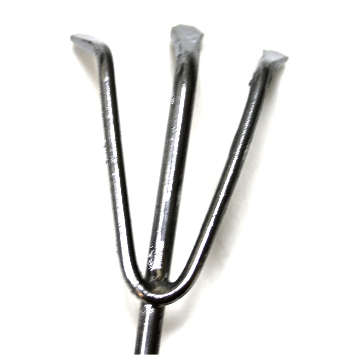 Cast from the real thing, this is a handheld three-tined garden hand rake. Molded from flexible urethane plastic, it features a hand painted simulated wood grain handle and shiny chrome rake.