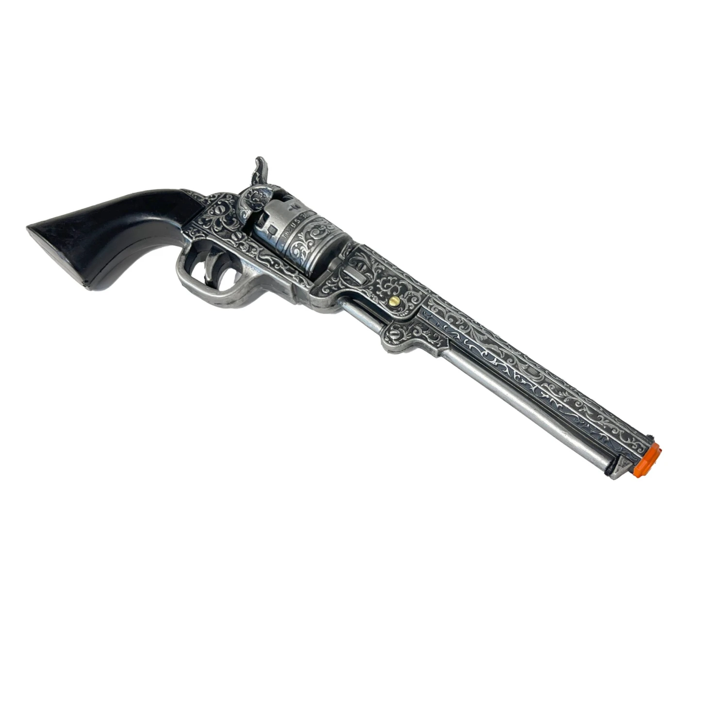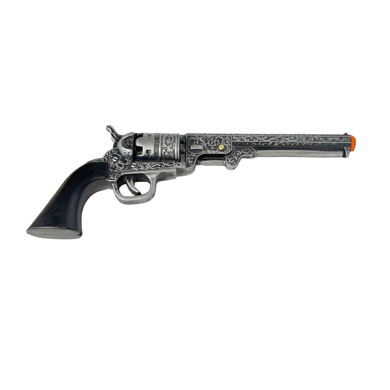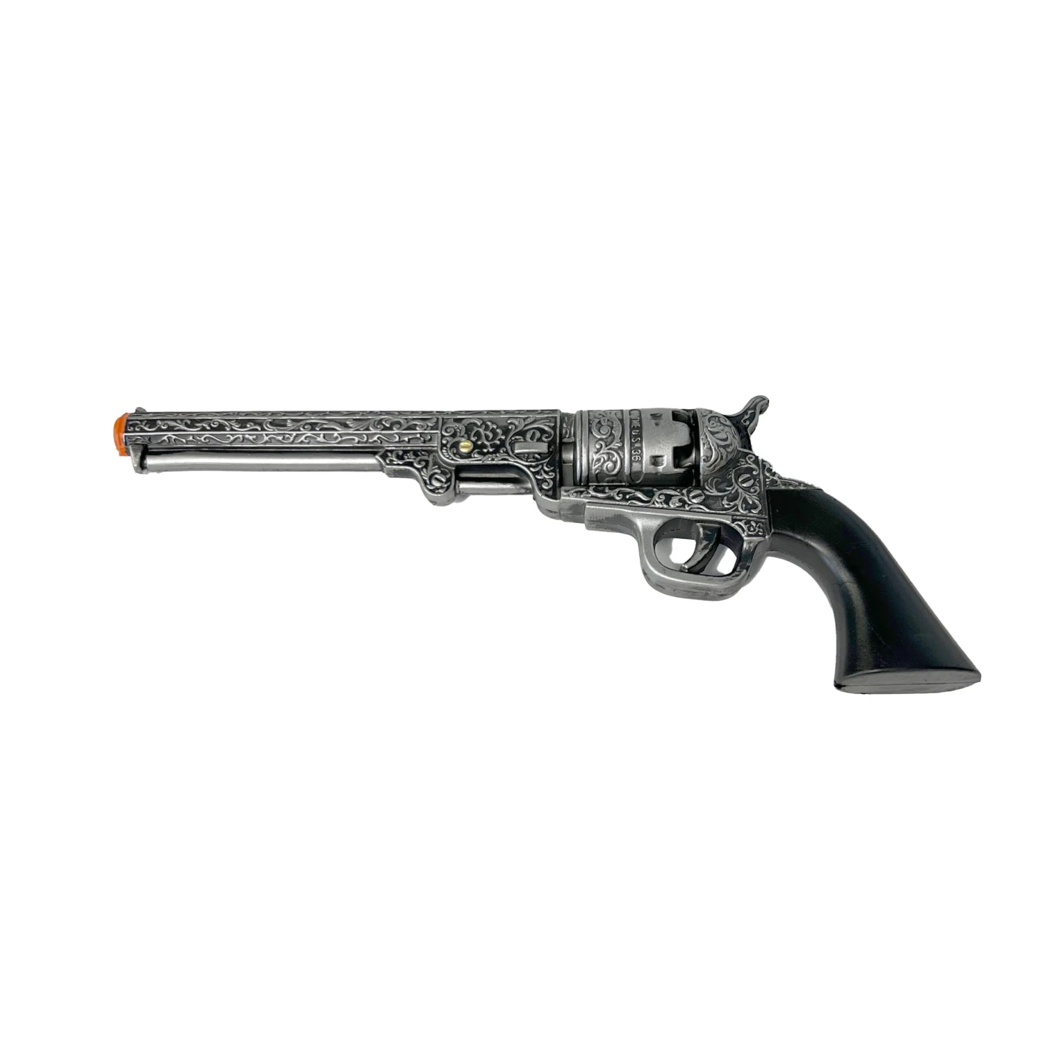 Add a touch of the Old West to your next scene with this detailed foam rubber revolver replica. Designed to resemble a classic mid-19th-century Colt revolver, this prop combines authenticity with safety, featuring ornate silver engravings along the barrel and cylinder. The faux wooden-style grip adds to its vintage aesthetic, making it perfect for period dramas, westerns, or any production needing a historic firearm replica.