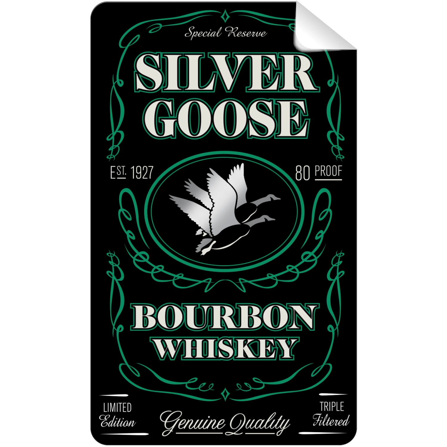 “Silver Goose Whiskey” bottle color label printed on self adhesive label stock. Use on our breakaway or break resistant bottles to add realism to your scene.Â