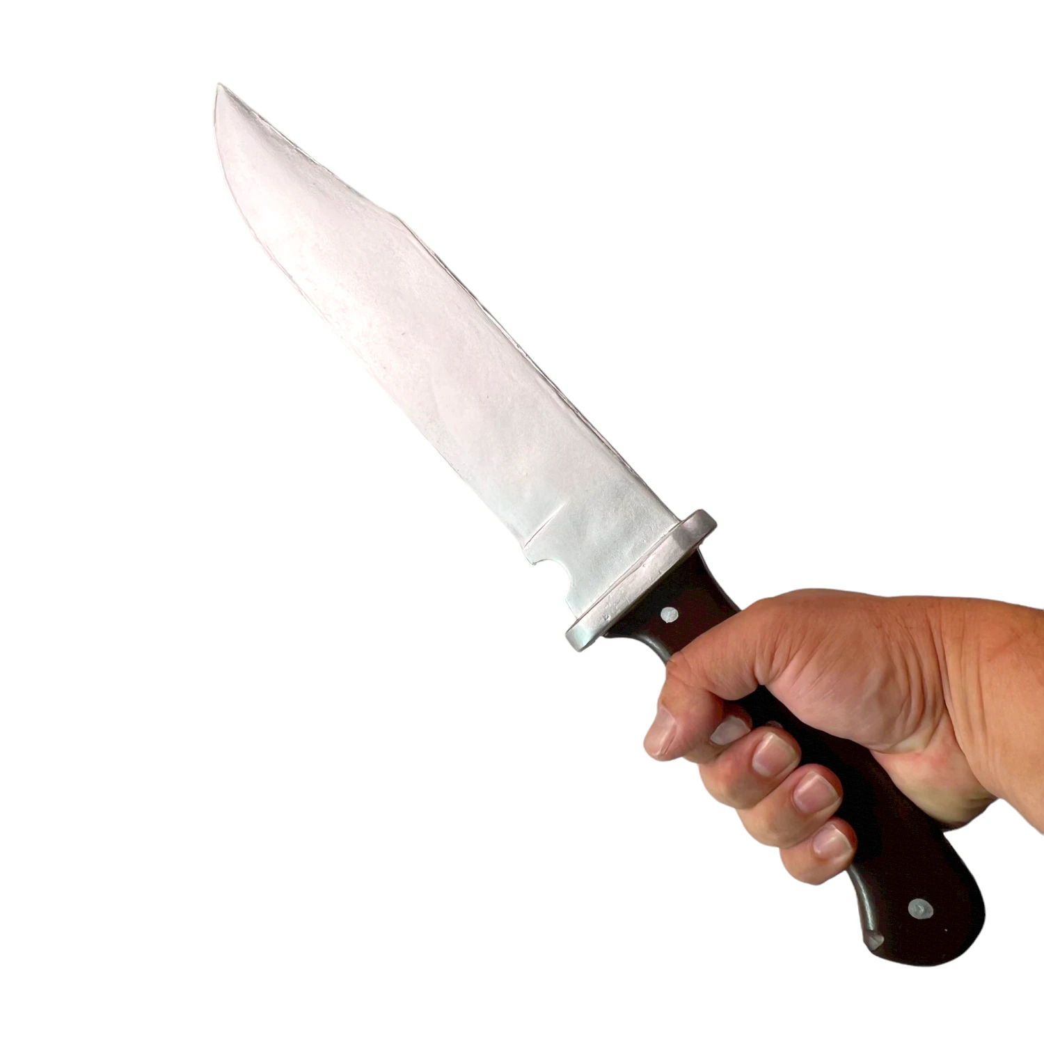 Intimidate street thugs with this beautiful Survival Style Hunting Knife replica! Molded from a real fixed-blade Bowie Knife, our replica is hand-cast in soft but durable urethane foam rubber and is much safer than its real-life counterpart. Each Survival Hunting Knife replica features an 11.5 inch expertly painted bright silver blade, intricate wood-grain detailing, and silver finished rivets and crossbar.